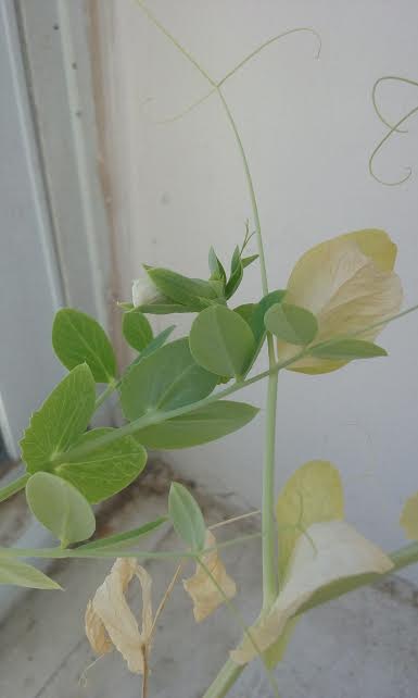 This pea plant is doing fairly well, despite the yellowed and dried leaves in certain areas. Can you see the white flower bud?
