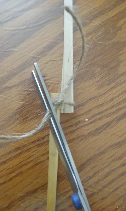 - Loop twine underneath each area the horizontal stick meets the left and right vertical stick, then tie three times (pictures depicting this are shown farther below). It’s pretty much the same process as when you were creating the vertical sticks. Make sure to cut off any loose ends of the twine using the scissors.