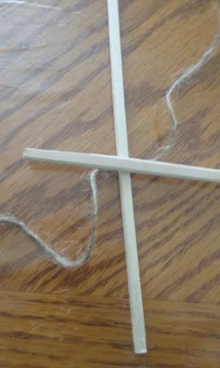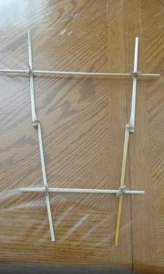 - Loop twine underneath each area the horizontal stick meets the left and right vertical stick, then tie three times (pictures depicting this are shown farther below). It’s pretty much the same process as when you were creating the vertical sticks. Make sure to cut off any loose ends of the twine using the scissors.