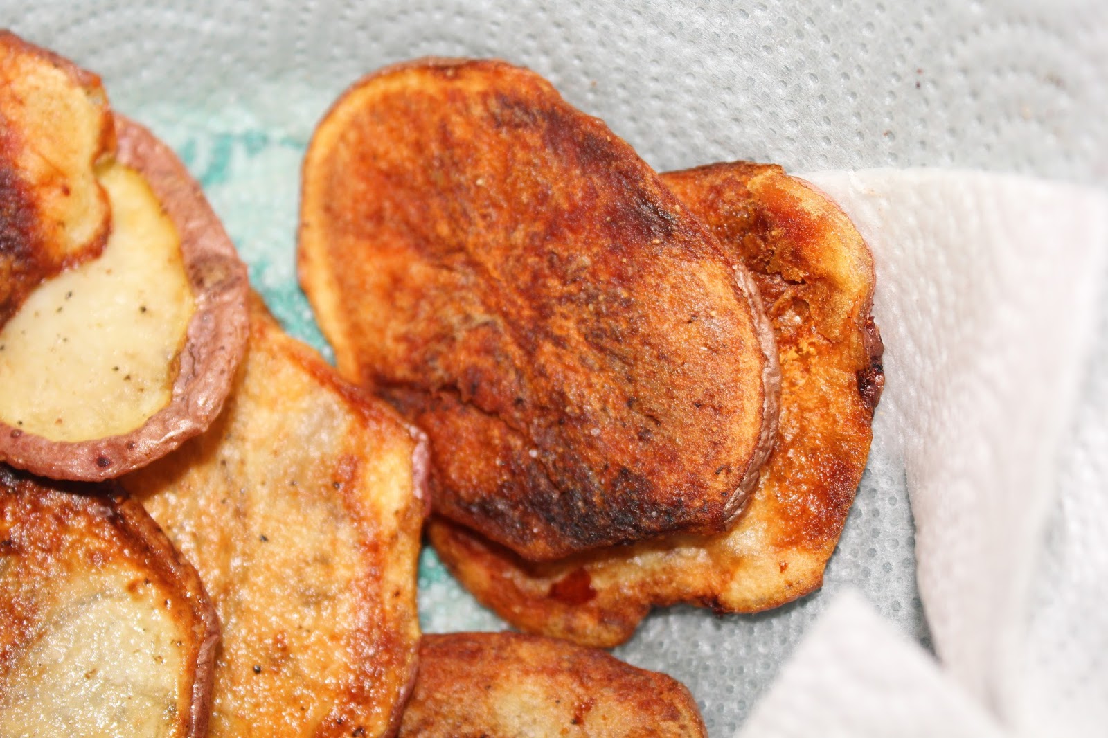 - Remove baking sheet(s) from the oven and transfer your homemade potato chips over to a bowl. My mom put a paper towel in it before I could say anything, but this isn’t necessary. I composted the paper towel afterwards (and I will admit it did absorb some of the excess oil) so nothing went to waste.