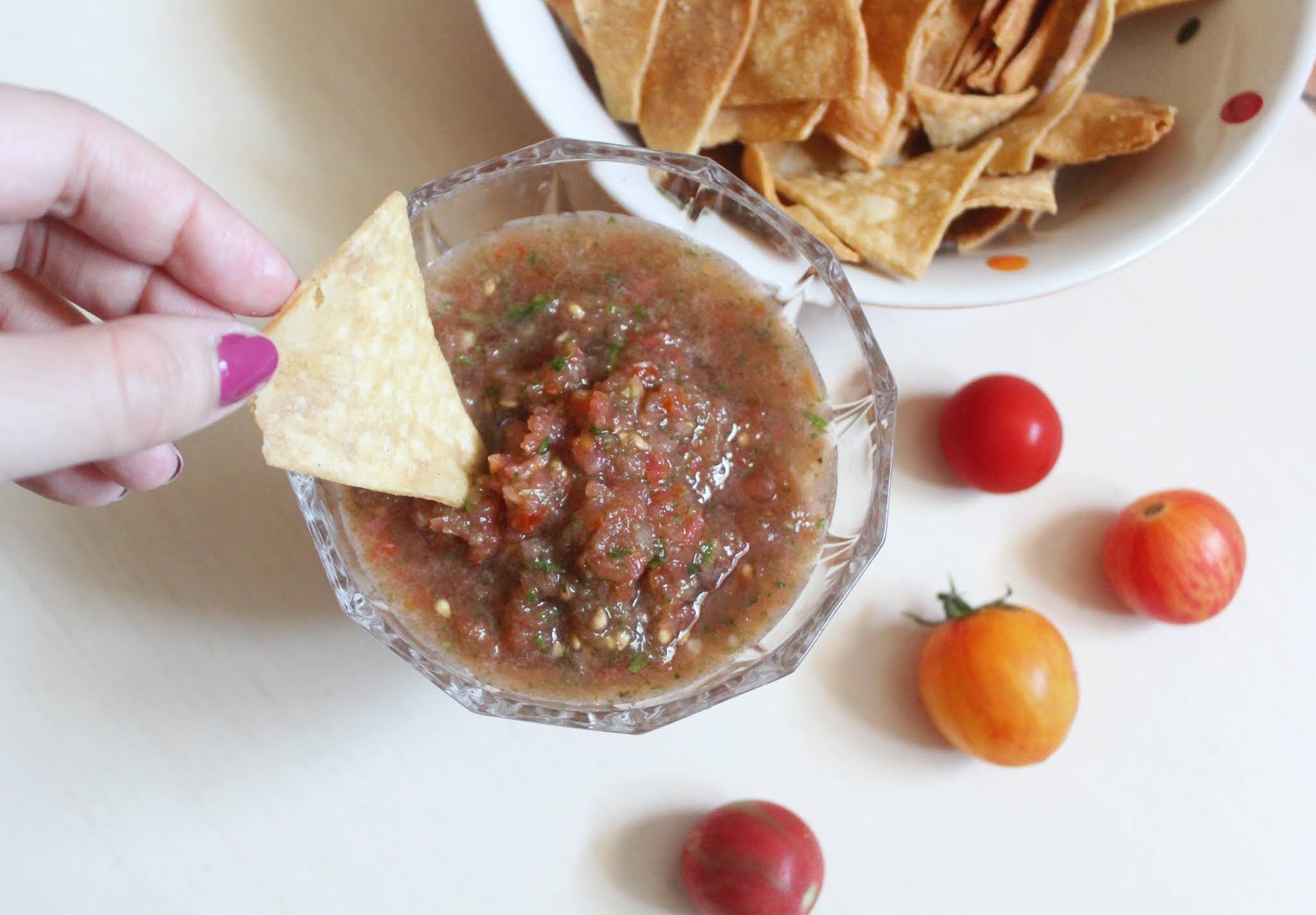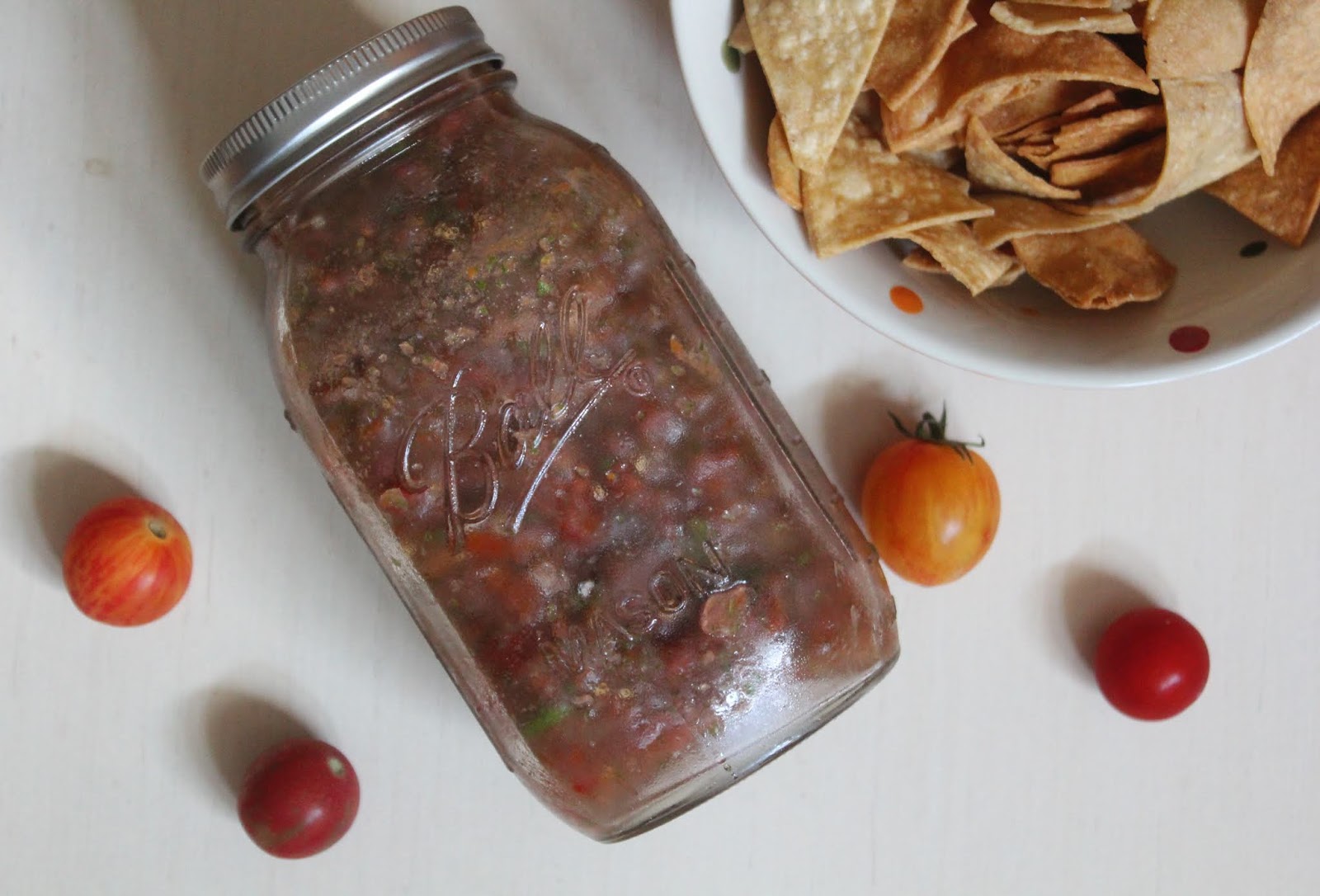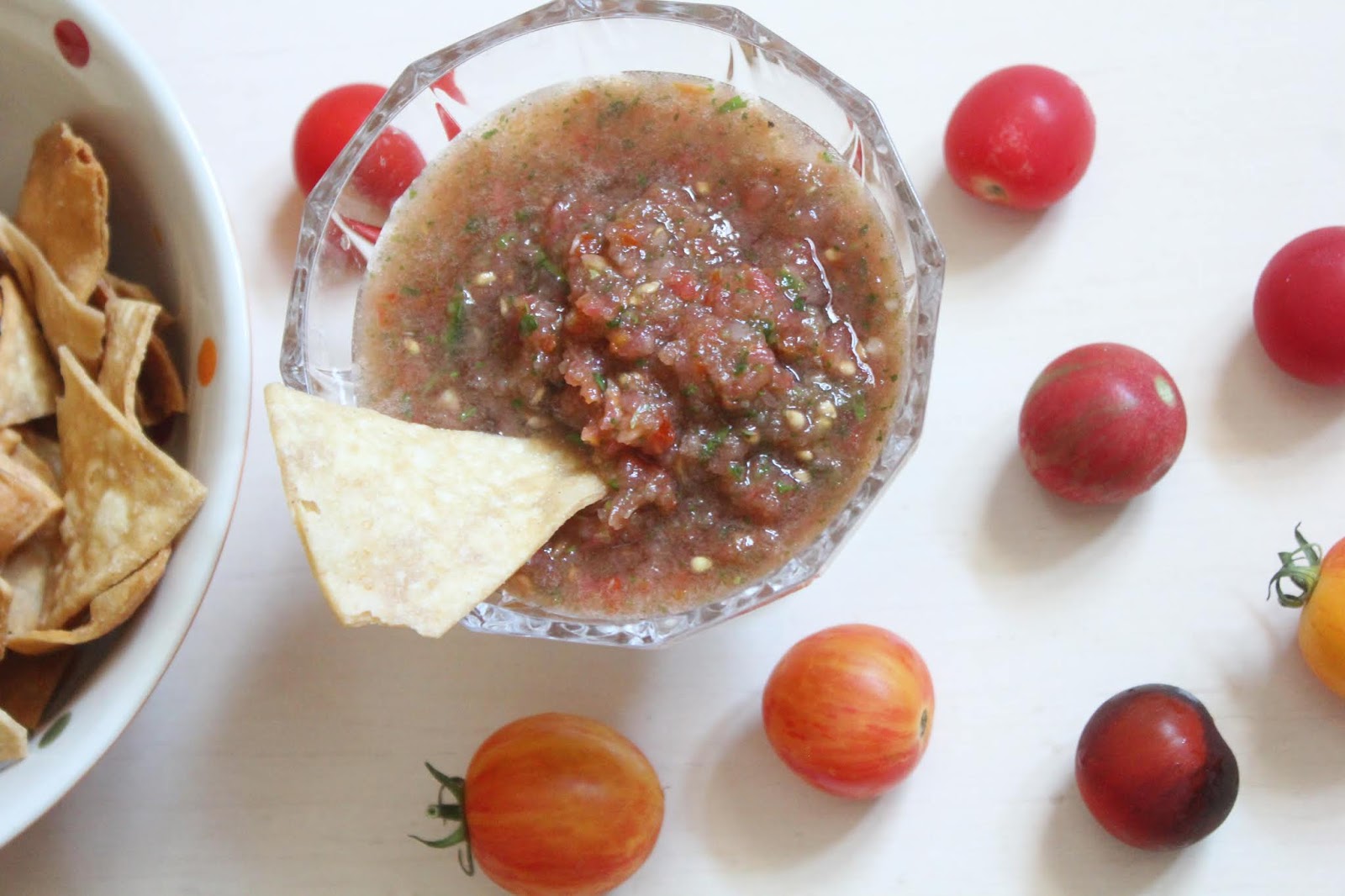 Also, don’t be alarmed if the salsa isn’t the brightest red color on the block. Taste matters way more than looks! However, if you find you want it a little more red in color, adding a few more tomatoes won’t hurt. You can use any kind of tomatoes you want in this recipe – plum, cherry, beefsteak, whatever. I just suggested grabbing big heirloom tomatoes because they’re what I prefer.